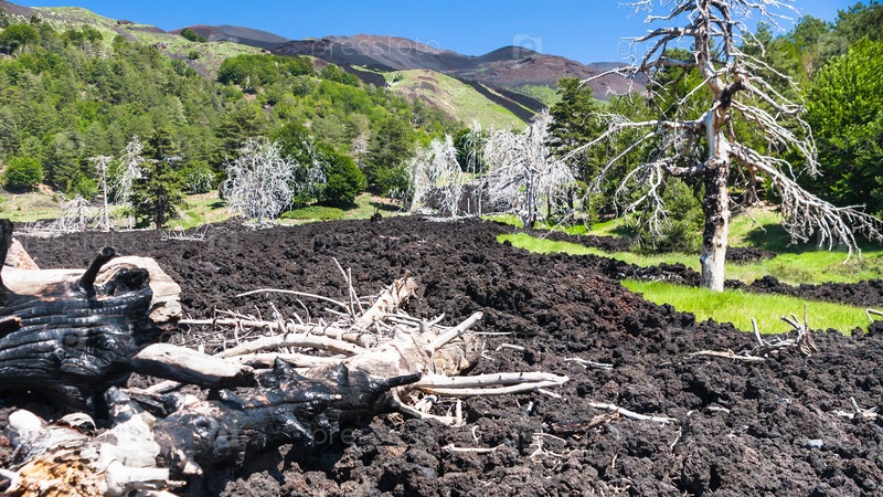 Высушенные деревья в застывшем потоке лавы на Этне