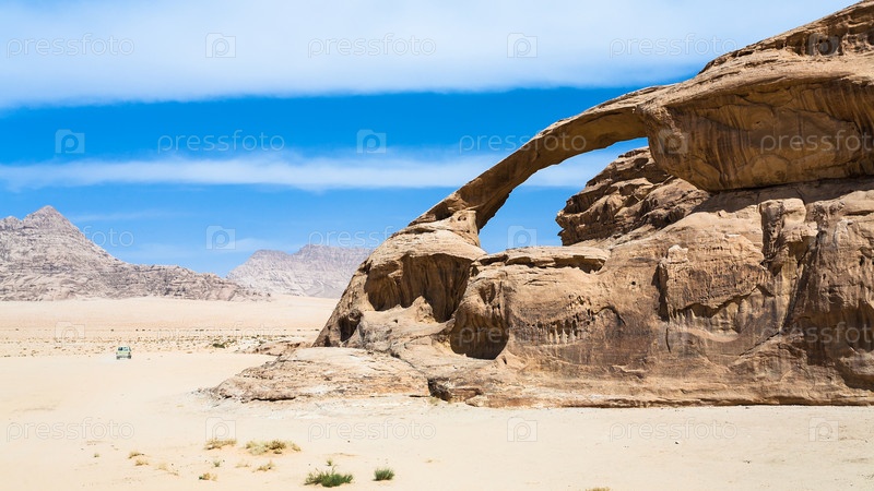 Автомобиль возле скалы из песчаника в пустыне Вади Рам