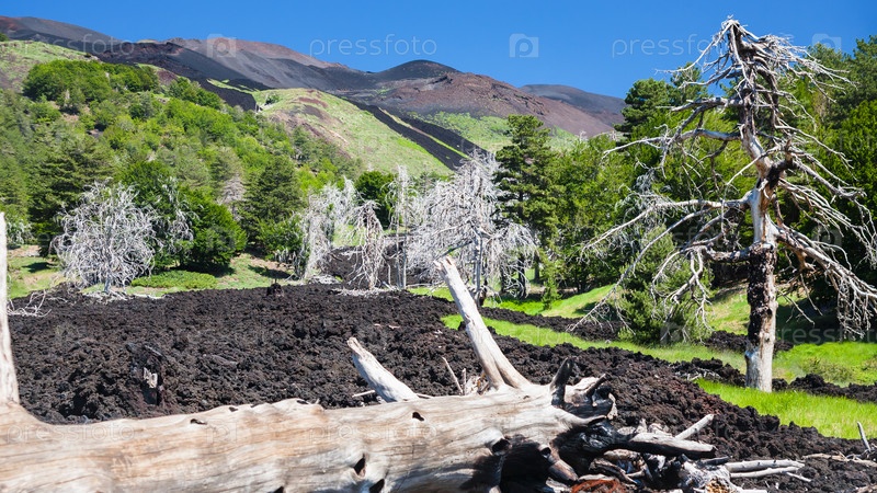 Сгоревшее дерево в закаленной лавовой струе на склоне Этны