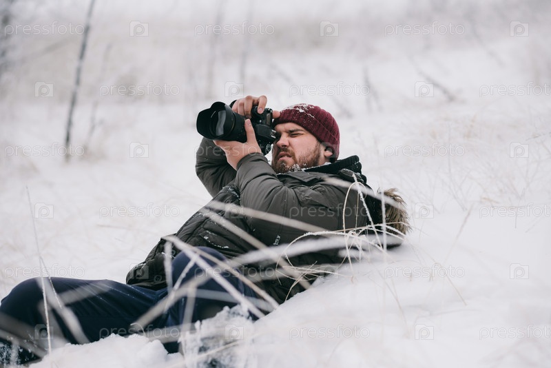 Фотограф-путешественник в зимнем лесу