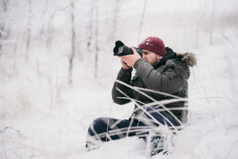 Фотограф-путешественник в зимнем лесу