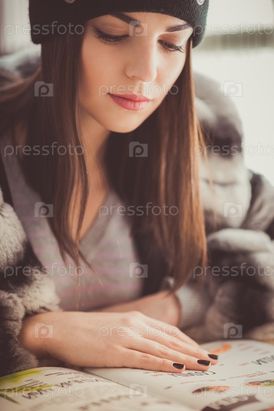 Девушка в меховом пальто смотрит меню