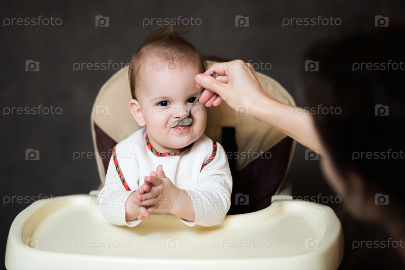 Мать кормит малыша из ложки