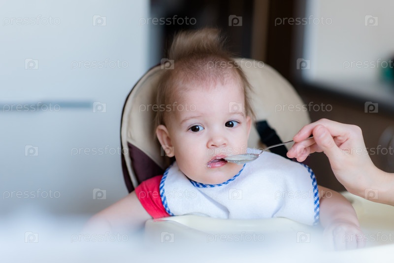 Мать кормит малыша из ложки