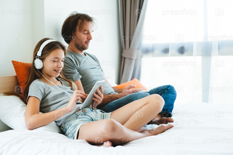 Отец и ребенок играют на планшете