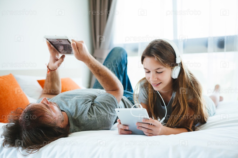 Отец и дочь играют на планшете
