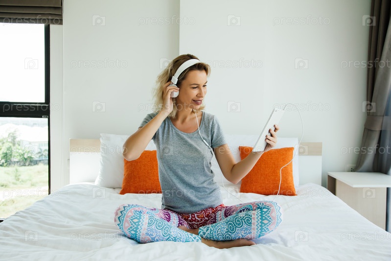Женщина слушает музыку в комнате