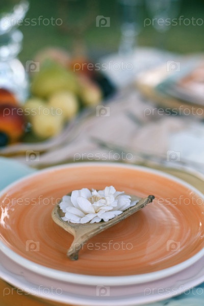 Оранжевая тарелка с красивым белым цветком