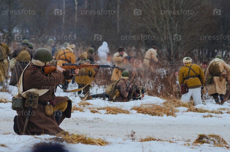 Советский солдат стреляет по фашистам во время военной реконструкции второй мировой войны