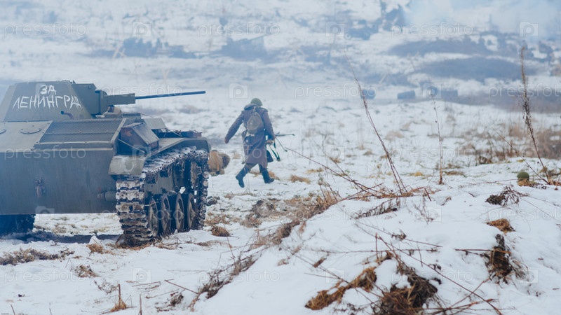 Советские солдаты атакуют немцев во время военной реконструкции второй мировой войны