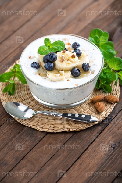 Йогурт со свежей черникой, бананами и миндальными орехами