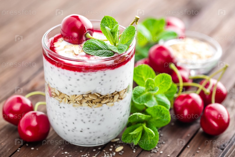 Свежий вишневый йогурт с мюсли и семенами чиа