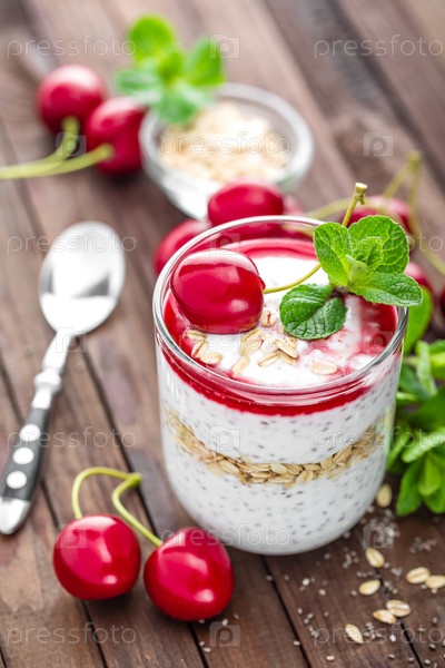 Свежий вишневый йогурт с мюсли и семенами чиа