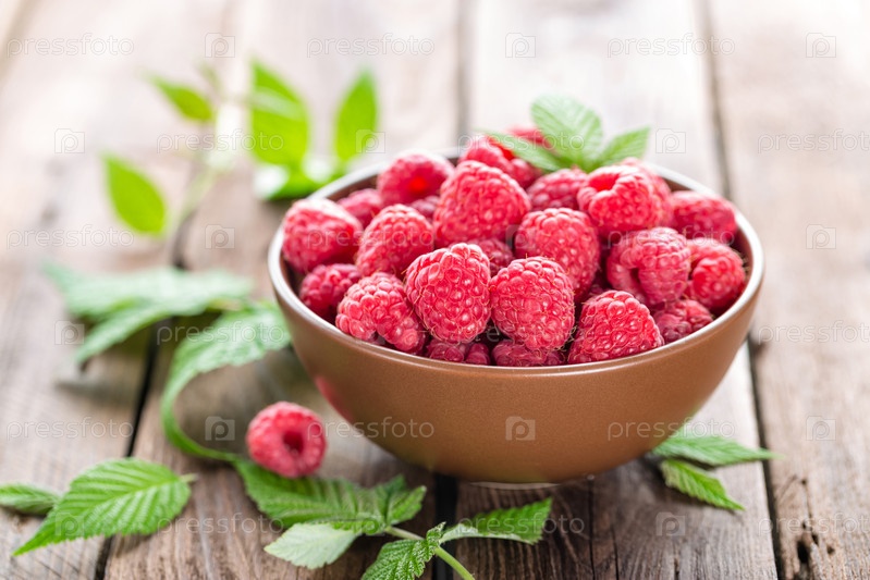 Свежая малина с листьями на деревянном фоне