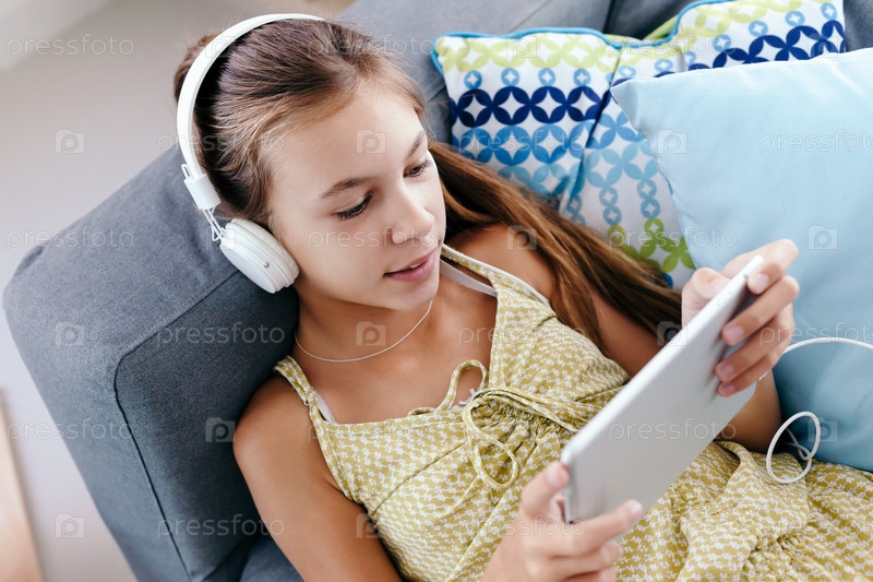 Девушка с наушниками на диване у себя дома