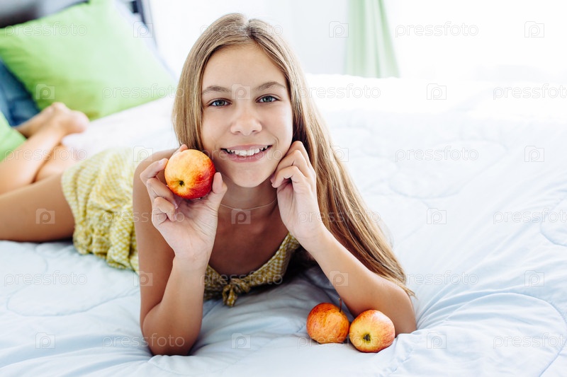 Девочка ест яблоко в спальне