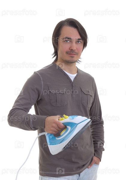 Портрет молодого мужчины с утюгом на белом фоне