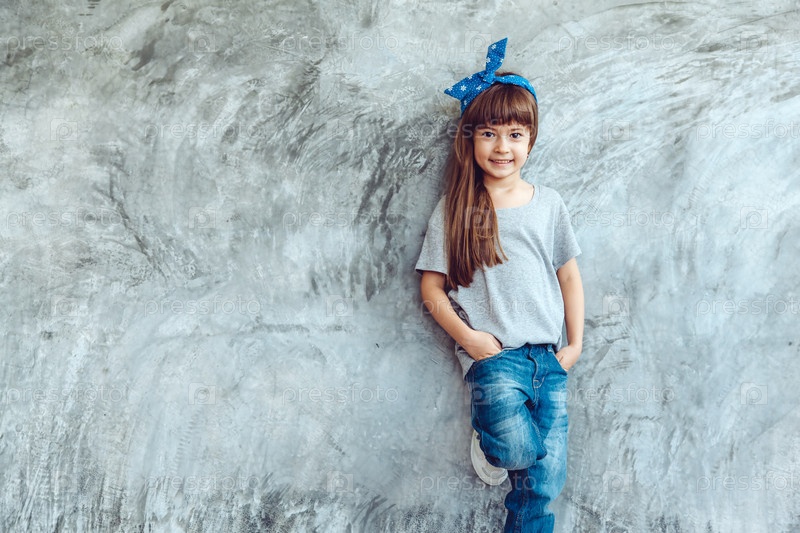 Девочка в серой футболке у стены