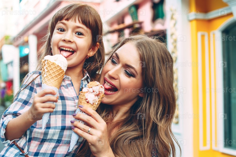 Мама с ребенком едят мороженое на улице города