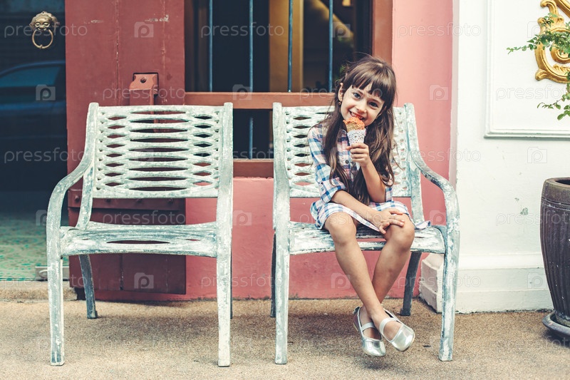 Ребенок ест мороженое на городской улице