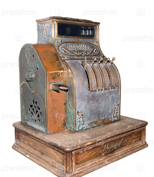 Музейный кассовый аппарат изолирован на белом фоне с обтравочным контуром