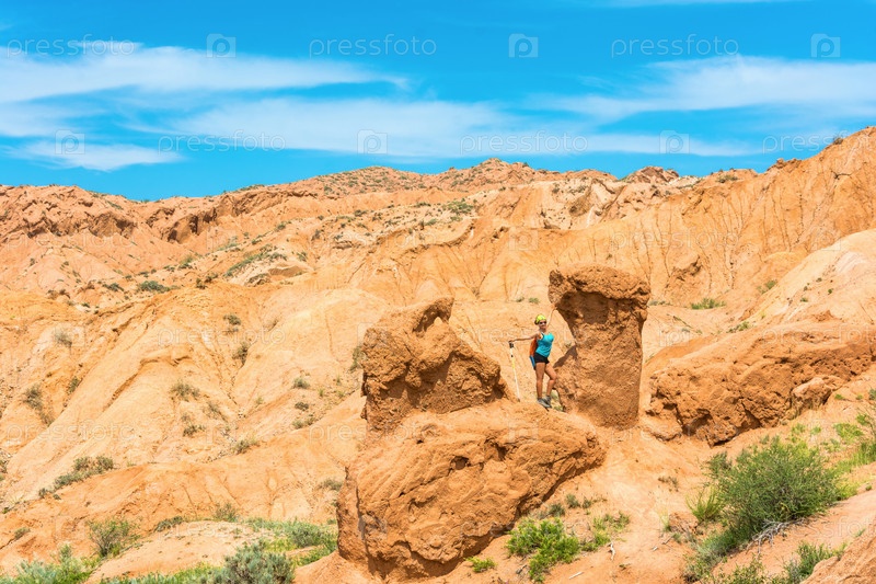 Красивая девушка в оранжевых скалах ущелья Сказка, Кыргызстан