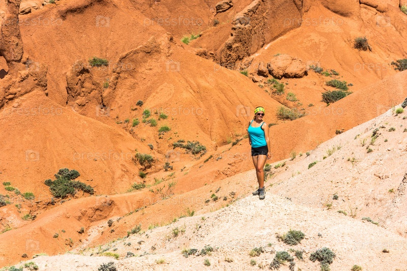 Красивая девушка в оранжевых скалах ущелья Сказка, Кыргызстан