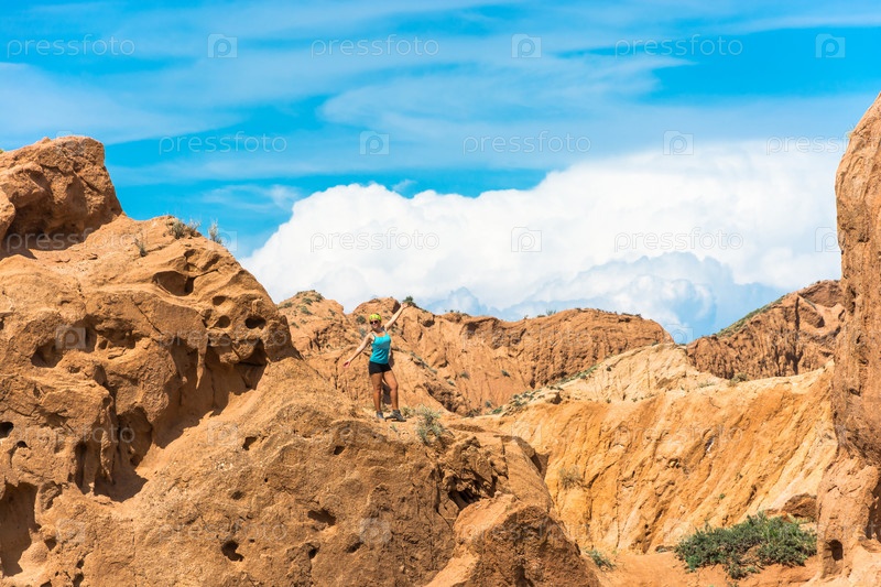 Красивая девушка в оранжевых скалах ущелья Сказка, Кыргызстан