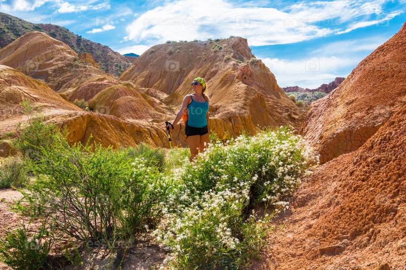 Красивая девушка на фоне оранжевых скал и зеленых кустов с белыми цветами
