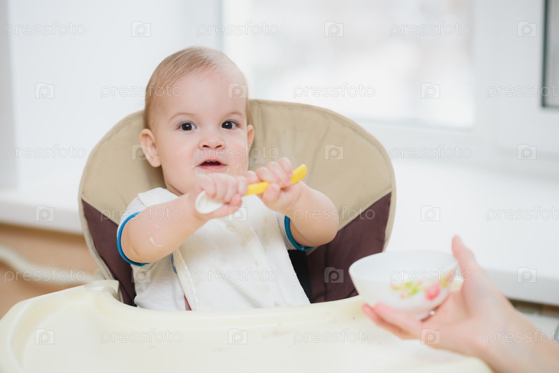 Мать кормит малыша с ложки