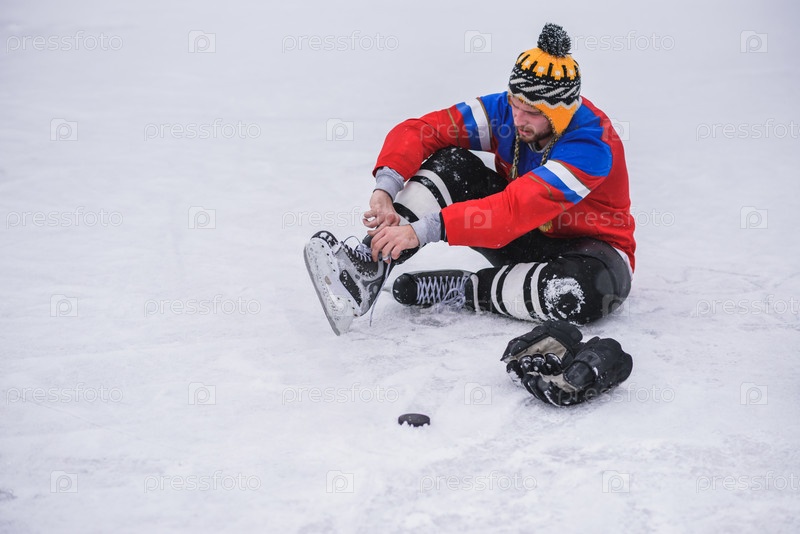 Хоккеист сидит на льду