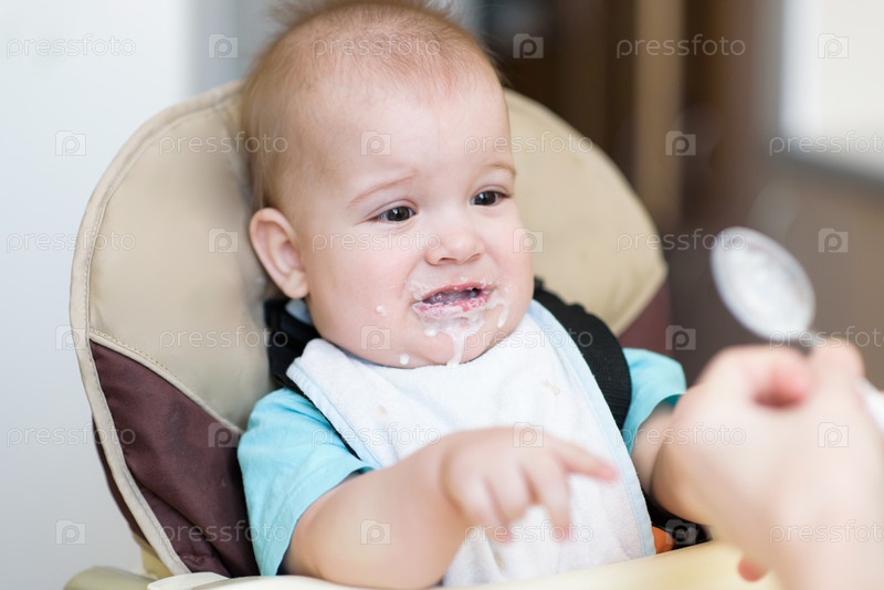 Мать кормит малыша с ложки