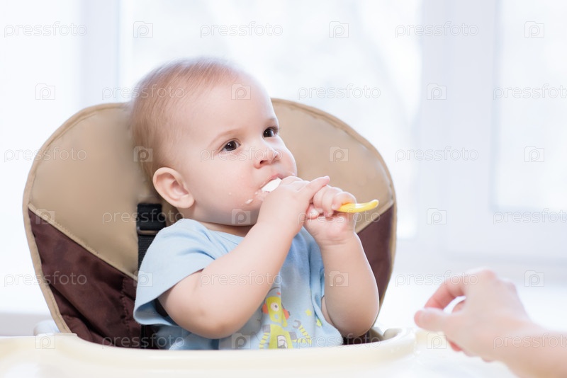 Мать кормит малыша с ложки