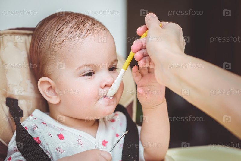 Мать кормит малыша с ложки