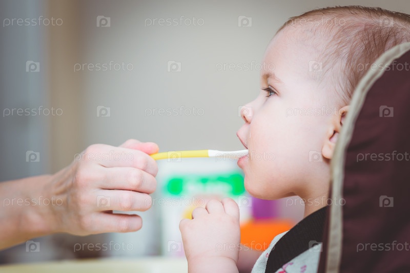 Мать кормит малыша с ложки