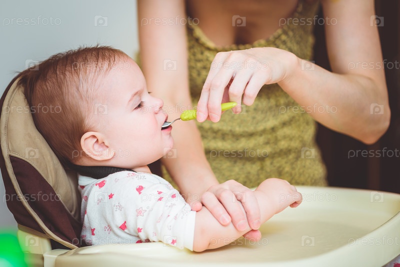 Мать кормит малыша с ложки