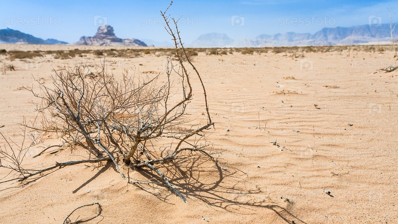 Высушенное растение и вид скалы Сфинкса в Вади-Раме