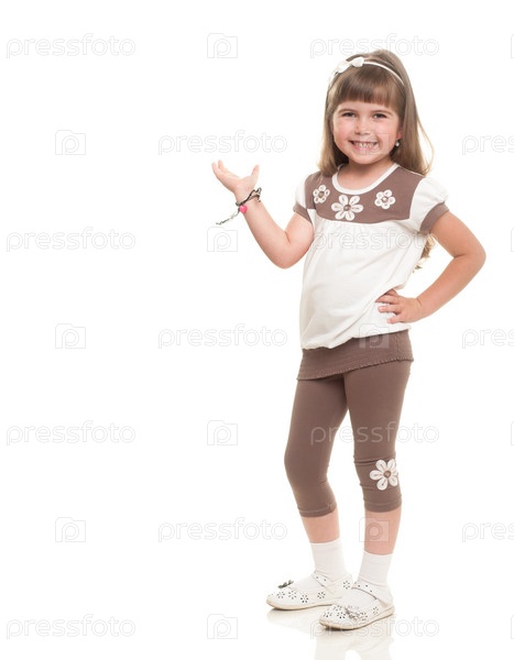 Симпатичная девочка держит что-то на ладони на белом фоне