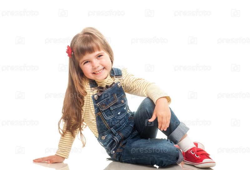 Симпатичная девочка сидит на полу и улыбается на белом фоне