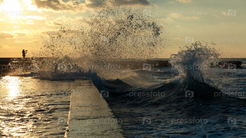 Человек фотографирует морские волны на фоне заката