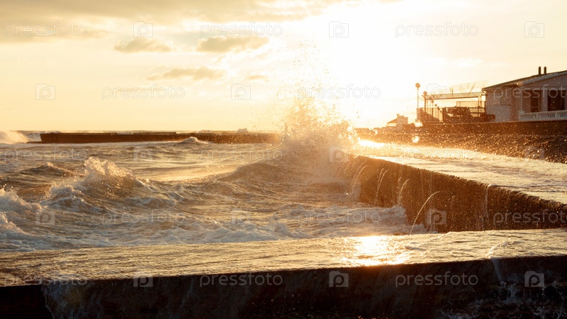 Морская волна разбивается о волнорез на фоне яркого закатного солнца
