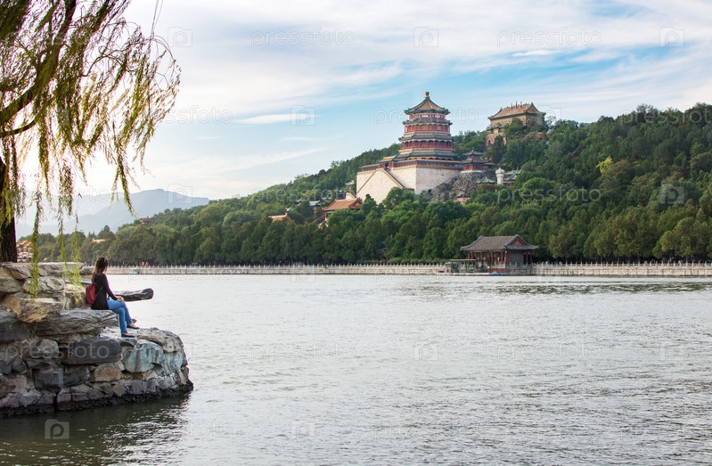 Девушка наслаждается видом летнего дворца в Пекине