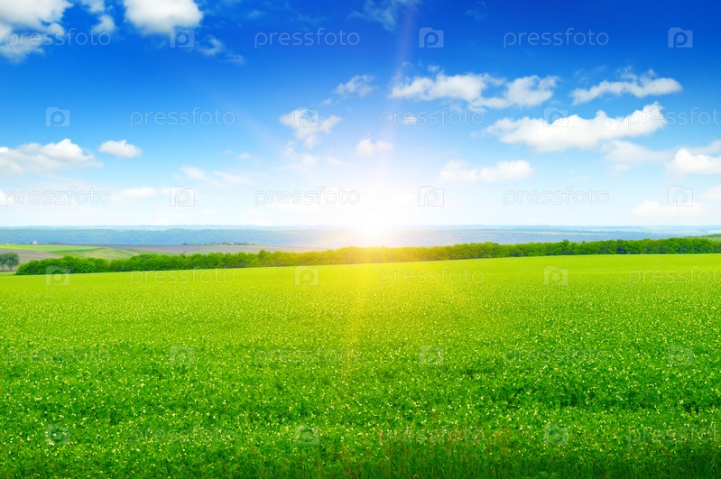 Поле, восход и голубое небо