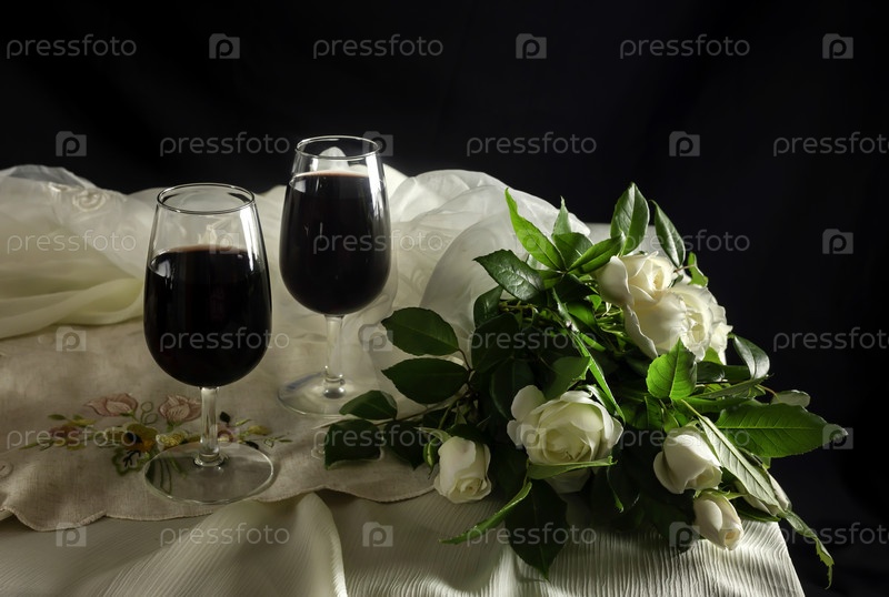 Два бокала с красным вином и букет роз