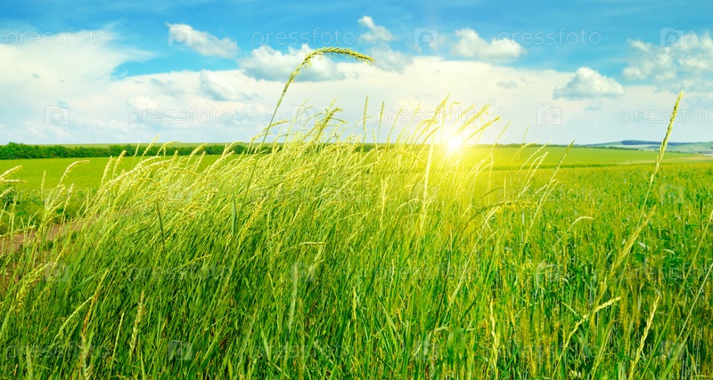 Поле, облачное небо и восход солнца