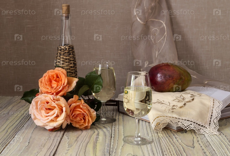 Два бокала с белым вином, манго и букет из роз