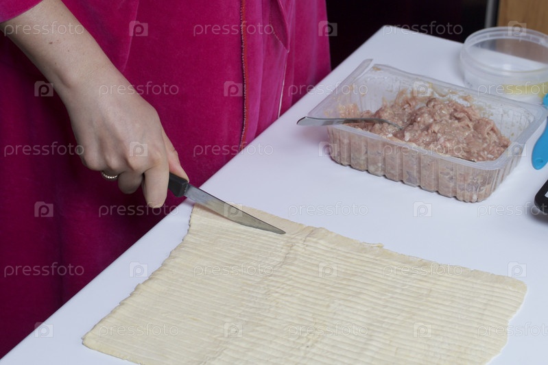 Женщина нарезает тонкие полоски теста