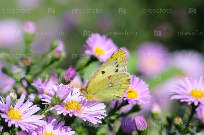 Желтая бабочка собирает нектар