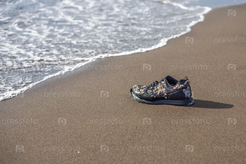 Старый кроссовок с морскими раковинами на песчаном пляже