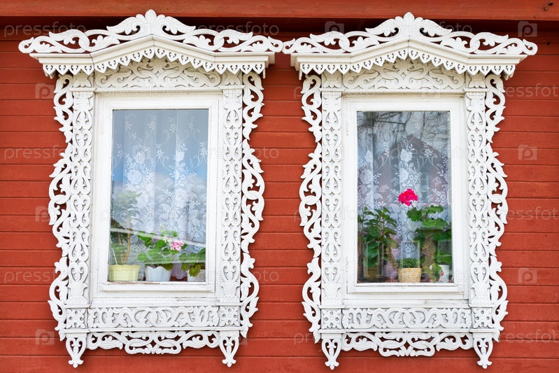 Окна с цветами на подоконниках в деревенском доме